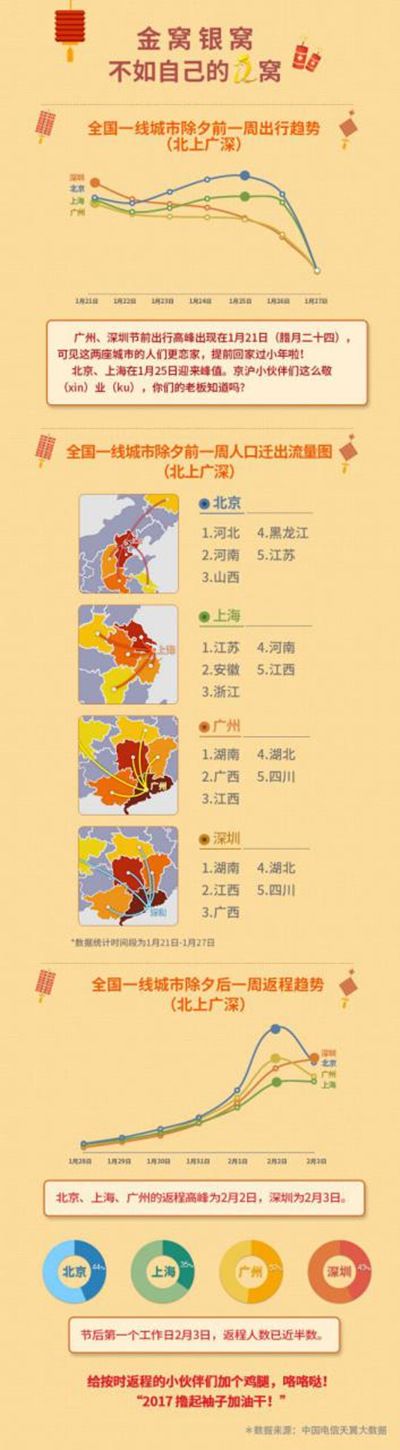 春节回家过年是大多数中国人春节的必修课,这也带来了春节期间的大规模人口流动,而2017年一线城市中的广州、深圳的返乡高峰要早于北京和上海。