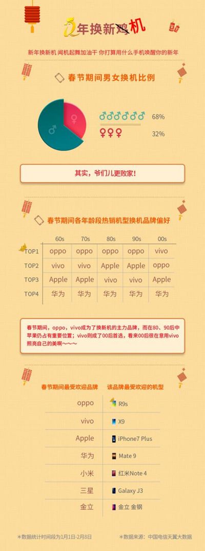 天翼大数据显示,2017年元旦至2月8日期间,男性换机比例高达68%,女性为32%,oppo、vivo成为了换新机的主力品牌,vivo成为00后首选,而在80、90后中,苹果仍占有重要位置。