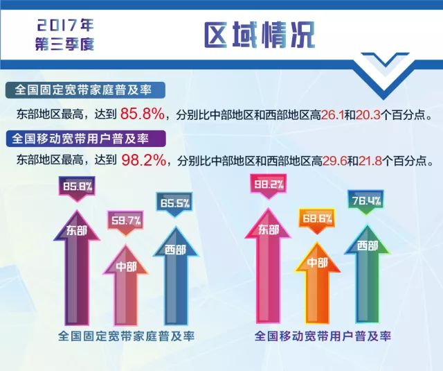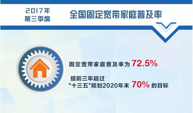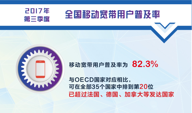报告显示,截至2017年第三季度,我国固定宽带家庭用户数累计达到32115.7万户,普及率达到72.5%;移动宽带(3G和4G)用户数累计达到113769.9万户(包含基础电信企业和移动转售业务服务提供商的移动宽带用户),移动宽带用户普及率达到82.3%。