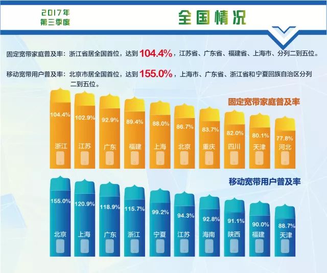 从各地的宽带发展普及状况看,固定宽带家庭普及率方面,浙江省最高,达到104.4%,江苏省也达到102.9%,超过了100%(固定宽带家庭普及率超过100%,主要是存在一个家庭用户拥有多个固定住所,办理了多个固定宽带接入业务的情况),排在前五位的地区还有广东省、福建省和上海市。移动宽带用户普及率方面,北京市达到155.0%,远远超过其他地区,超过100%的还有上海市(120.9%)、广东省(118.9%)和浙江省(115.7%),宁夏回族自治区99.2%排在全国第五,也接近100%。