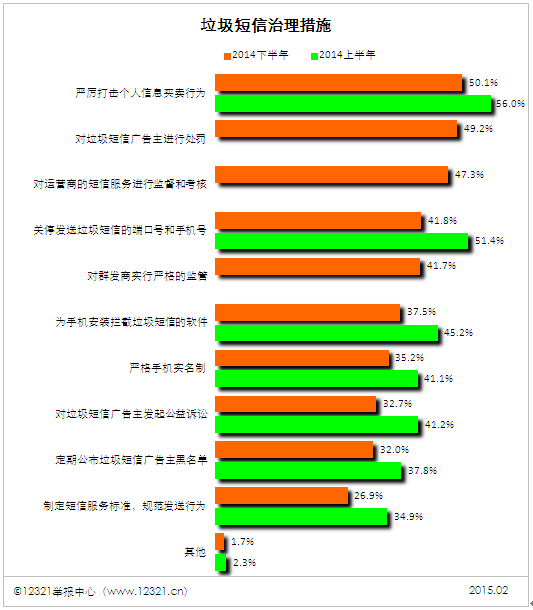 “对垃圾短信广告主进行处罚”(本期新增选项)选择比例为49.2%,居第二位;