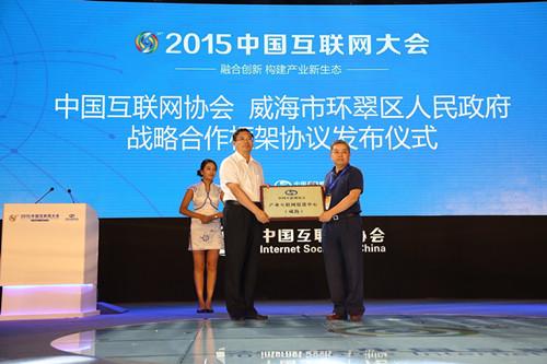 在闭幕论坛上,中国互联网协会与山东省威海市环翠区人民政府发布产业互联网促进中心(威海)合作框架战略协议。中国互联网协会秘书长卢卫表示,双方将在威海联合成立产业互联网促进中心,建立产业互联网创新基地,在产业互联网升级、大型互联网企业投资兴业、互联网创新创业等三个方面进行合作,搭建政府、社会组织和企业的桥梁纽带。随后,中国互联网协会秘书长卢卫和威海市环翠区区委书记林红玉共同为环翠区授牌。