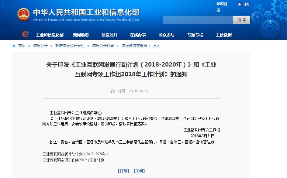 6月7日,工信部印发《工业互联网发展行动计划(2018-2020年)》和《工业互联网专项工作组2018年工作计划》。