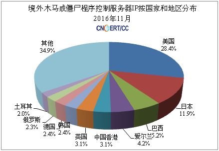 2016年11月,秘密控制我国大陆计算机的境外木马控制服务器IP有5909个,与上月的7608个相比减少了22.33%,主要来自美国、日本等国家,具体分布如图3所示。