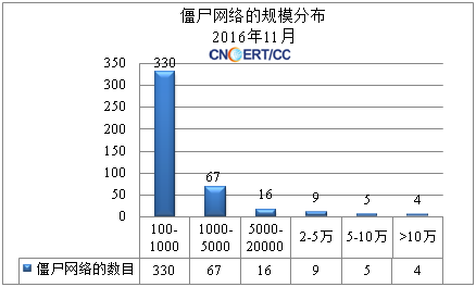 在发现的僵尸网络中,规模大于5000的僵尸网络有34个,规模在100-1000的有330个,规模在1000-5000的有67个,分布情况如图4所示。