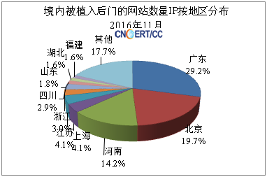 2016年11月,监测发现我国大陆地区5283个网站被植入后门程序,其分布情况如图5所示。其中,海南省13个(占全国0.25%),排全国第28位。