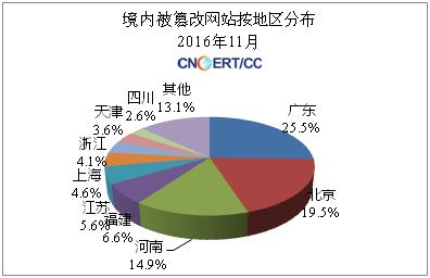 2016年11月,我国大陆地区被篡改网站5294个,与上月的4524个相比有所增加;其中,海南省3个(占全国0.06%),排名第27位。具体分布如图6所示。