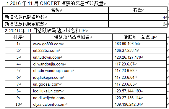 2016年11月,恶意代码捕获与分析系统监测得到的放马站点统计。
