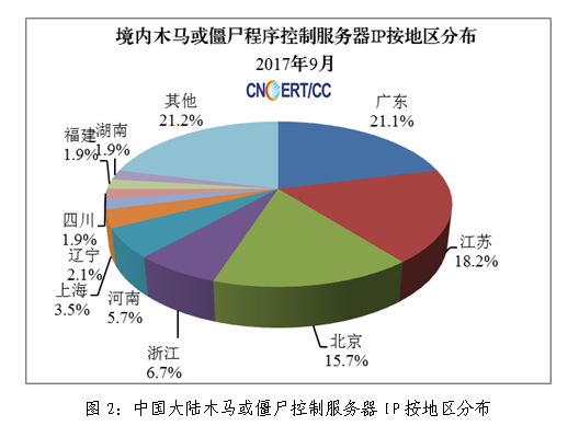 2017年9月,监测发现我国大陆地区2416个IP地址对应的主机被利用作为木马控制服务器,与上月的2901个相比减少了16.7%,其分布情况如图2所示。其中,海南省15个(占全国0.62%),全国排名第24位。