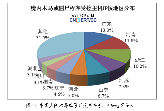 2017年9月,监测发现我国大陆地区1051278个IP地址对应的主机被其他国家或地区通过木马程序秘密控制,与上月的1685365个相比减少了37.6%,其分布情况如图1所示。其中,海南省10985个(占全国1.04%),全国排名第23位。