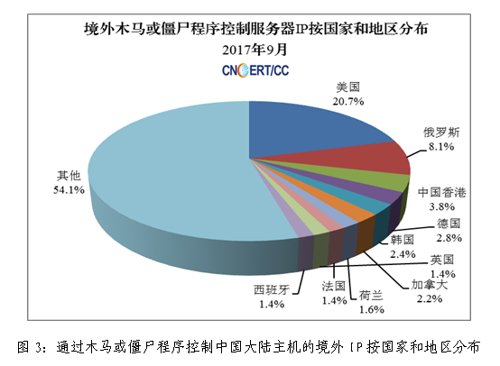 2017年9月,秘密控制我国大陆计算机的境外木马控制服务器IP有5560个,与上月的7042个相比减少了21%,主要来自美国、俄罗斯等国家,具体分布如图3所示。