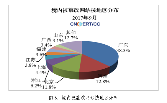 2017年9月,我国大陆地区被篡改网站 5494个,与上月的6109个相比稍有回落;其中,海南省7个(占全国0.13%),排名第25位。具体分布如图6所示。