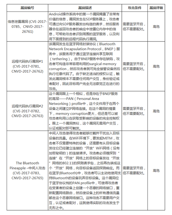 近日,国家信息安全漏洞共享平台(CNVD)收录了蓝牙(Bluetooth)协议存在的8个安全漏洞。由于漏洞涉及到基础协议,影响到Android、iOS、Windows以及Linux系统设备甚至使用短距离无线通信技术的物联网设备,相关设备范围十分广泛。综合利用上述漏洞,攻击者还可以控制设备,突破访问企业数据和网络,向横向相邻的设备传播恶意软件,极有可能导致大规模蠕虫的跨网攻击。