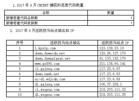 2017年9月,恶意代码捕获与分析系统监测得到的放马站点统计。