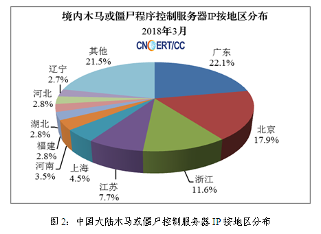 2018年3月,CNCERT监测发现我国大陆地区2259个IP地址对应的主机被利用作为木马控制服务器,与上月的1660 个相比增加了36.08%,其分布情况如图2所示。其中,海南省11个(占全国0.49%),全国排名第25位。