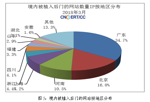 2018年3月,CNCERT监测发现我国大陆地区2858个网站被植入后门程序,比上月的1718个增加了66.36%,其分布情况如图5所示。其中,海南省2个(占全国0.07%),全国排名第28位。