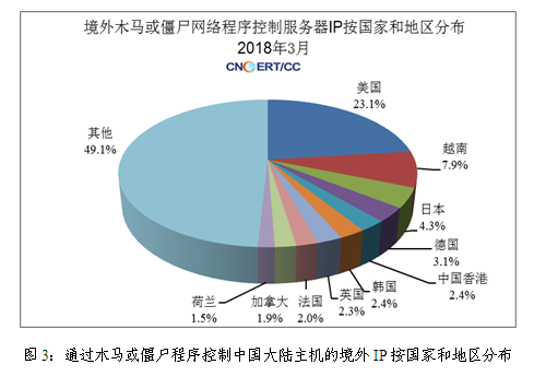 2018年3月,CNCERT监测发现秘密控制我国大陆计算机的境外木马控制服务器IP有15304个,与上月的7341个相比增加了108.47%,主要来自美国、越南、日本等国家,具体分布如图3所示。