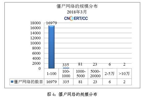 2018年3月,在CNCERT监测发现的僵尸网络中,规模大于5000的僵尸网络有31个,规模在100-1000的有335个,规模在1000-5000的有81个,分布情况如图4所示。
