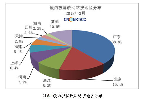 2018年3月,CNCERT监测发现我国大陆地区被篡改网站2559个,与上月的3678个相比减少了30.42%;其中,海南省5个(占全国0.20%),排名第21位。具体分布如图6所示。