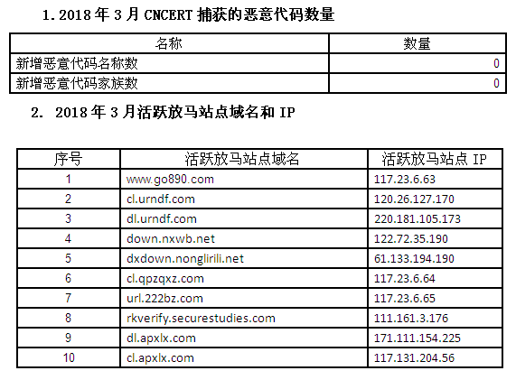 2018年3月,恶意代码捕获与分析系统监测得到的放马站点统计。