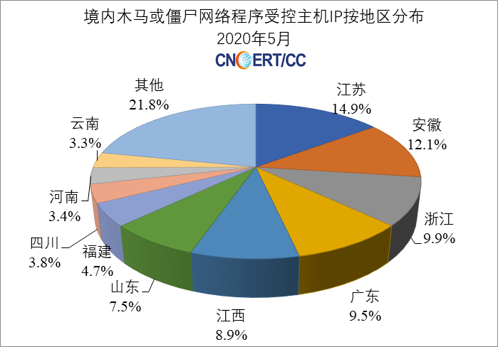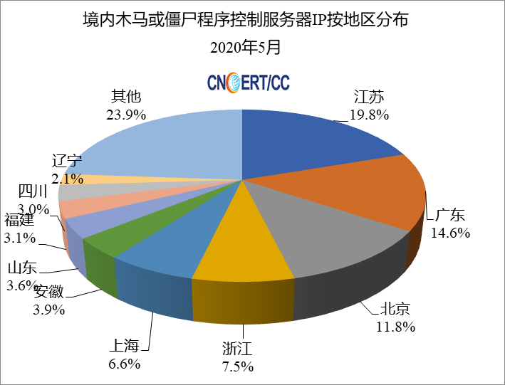 2020年5月,CNCERT监测发现我国大陆地区2064个IP地址对应的主机被利用作为木马控制服务器,与上月的2059个相比减少了5个。具体分布如下图2所示。