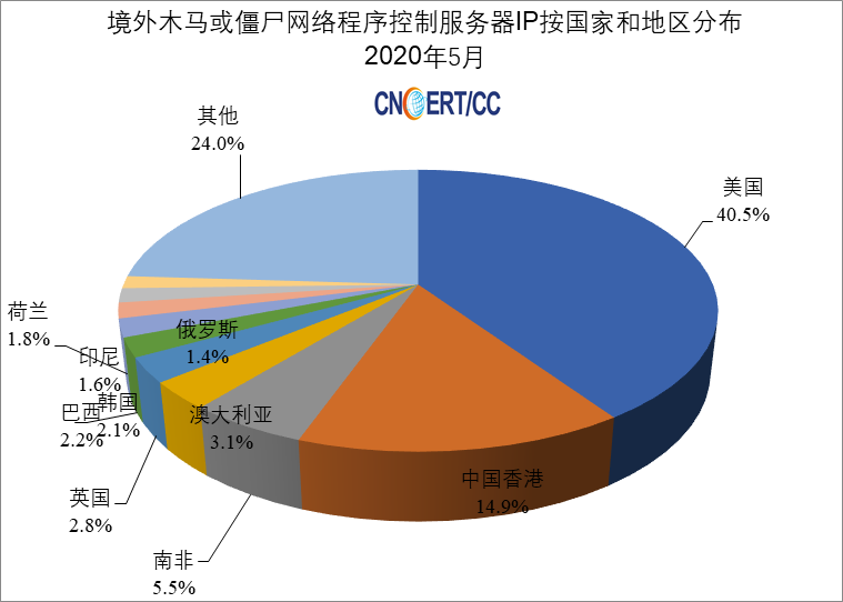2020年5月,CNCERT监测发现秘密控制我国大陆计算机的境外木马控制服务器IP有25207个,与上月的5428个相比增加了364%,主要来自美国、中国香港等国家或地区,具体分布如图3所示。