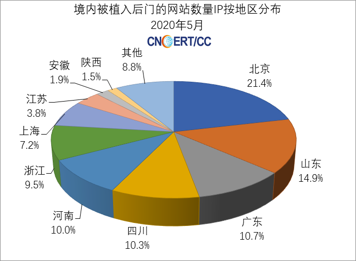 2020年5月,CNCERT监测发现我国大陆地区6913个网站被植入后门程序,比上月的5981个增加了15.58%,其分布情况如图4所示。其中,海南省5个(占全国0.07%),全国排名第28位。