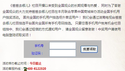 湖南卫视的亲子成长娱乐节目《爸爸去哪儿》在如火如荼进行中。近期,12321举报中心接到关于假冒“爸爸去哪儿”钓鱼的诈骗信息逐渐增加。不法分子通过欺诈短信发送虚假中奖钓鱼网站链接,后谎称用户中巨奖,通过收取“手续费、报名费”等方式实施诈骗。诈骗样板如下: