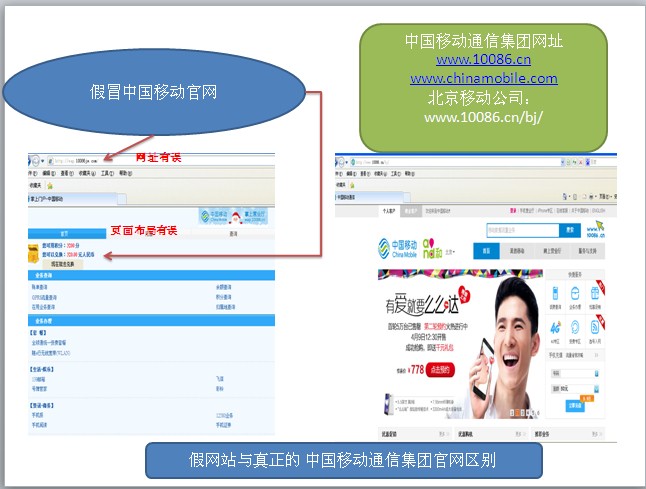 近两周来,12321举报中心收到有关假冒中国移动通信集团公司网站举报,虚假网址分别为:wap10086.net、wap.1860jf.com和wap.10086jw.com。不法分子利用十分相似的域名和界面迷惑用户登陆充值,窃取用户信息进而骗取钱财。相关截图如下: