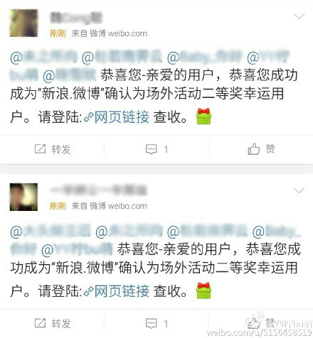 近期,12321举报中心接到多起举报通过新浪微博发送“新浪微博七周年”的中奖钓鱼诈骗行为。不法分子主要在新浪微博中以评论、私信或@的方式,谎称用户的微博账号被抽选为幸运用户,获得新浪大礼一份,从而诱骗用户访问钓鱼网站骗取用户信息及钱财。有的网友不仅收到诈骗信息而且在提交信息后收到威胁信息,不知应该怎么办?经与新浪官方核实,新浪微博并没有举办过周年庆典中奖活动。为此,12321举报中心提醒,警惕此类欺诈信息,不管骗子说什么,都不要相信。不法分子通过微博传播的欺诈信息样本如下: