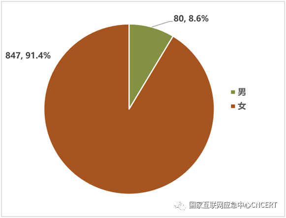 CNCERT监测发现,2017年12月,1058个受害者IP提交的信息共有1618条,经过初步分析,共涉及到927条有效身份信息。通过对这些有效身份信息分析发现,受害者年龄段分布情况如图12所示,覆盖了18-84岁的人群,其中20-40岁区间内占到了有效信息的50%以上,为主要的受害用户群体;受害者性别如图13所示,女性占比高达90%,说明女性更易受骗,值得高度关注。